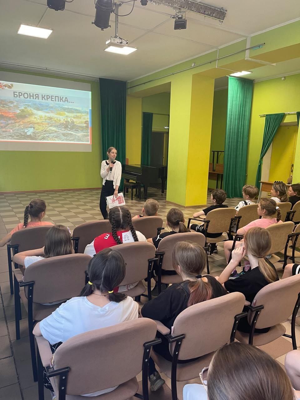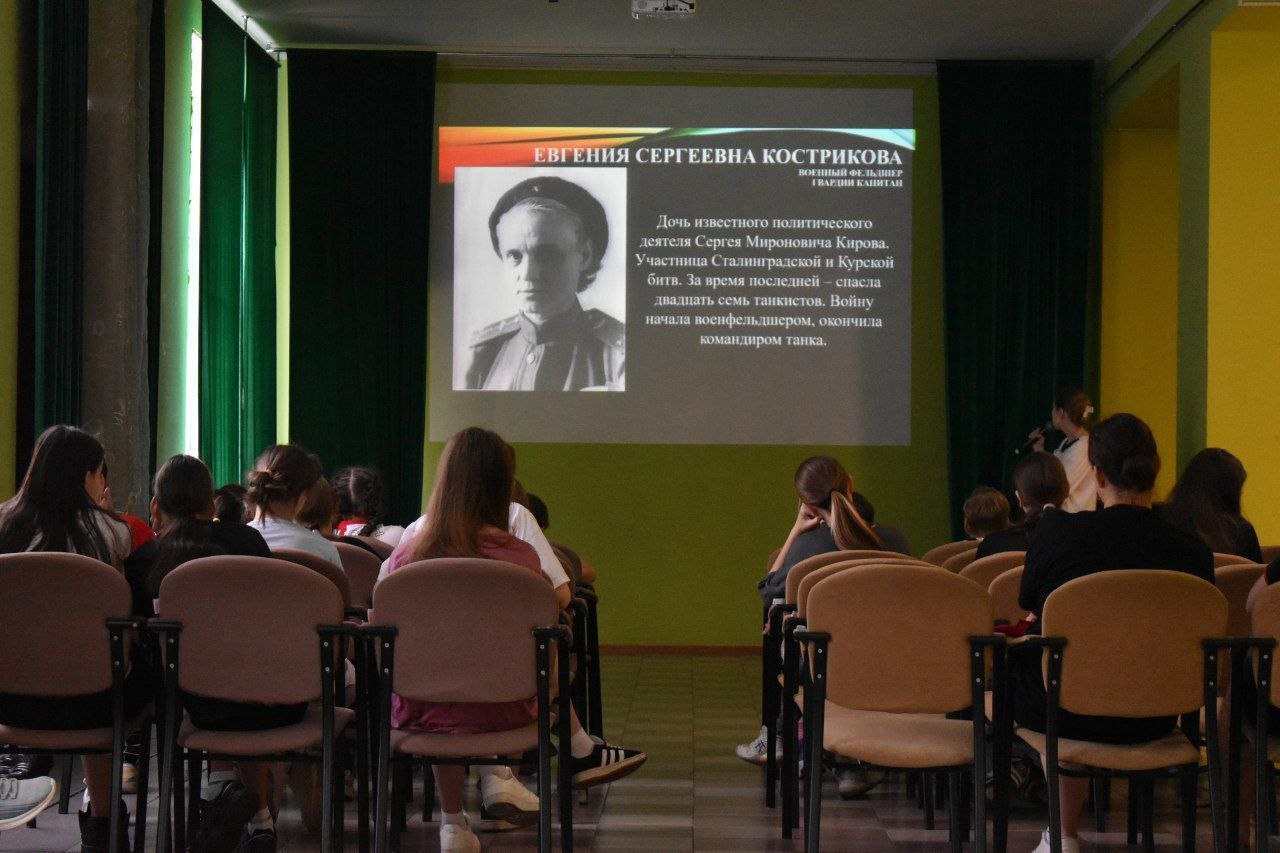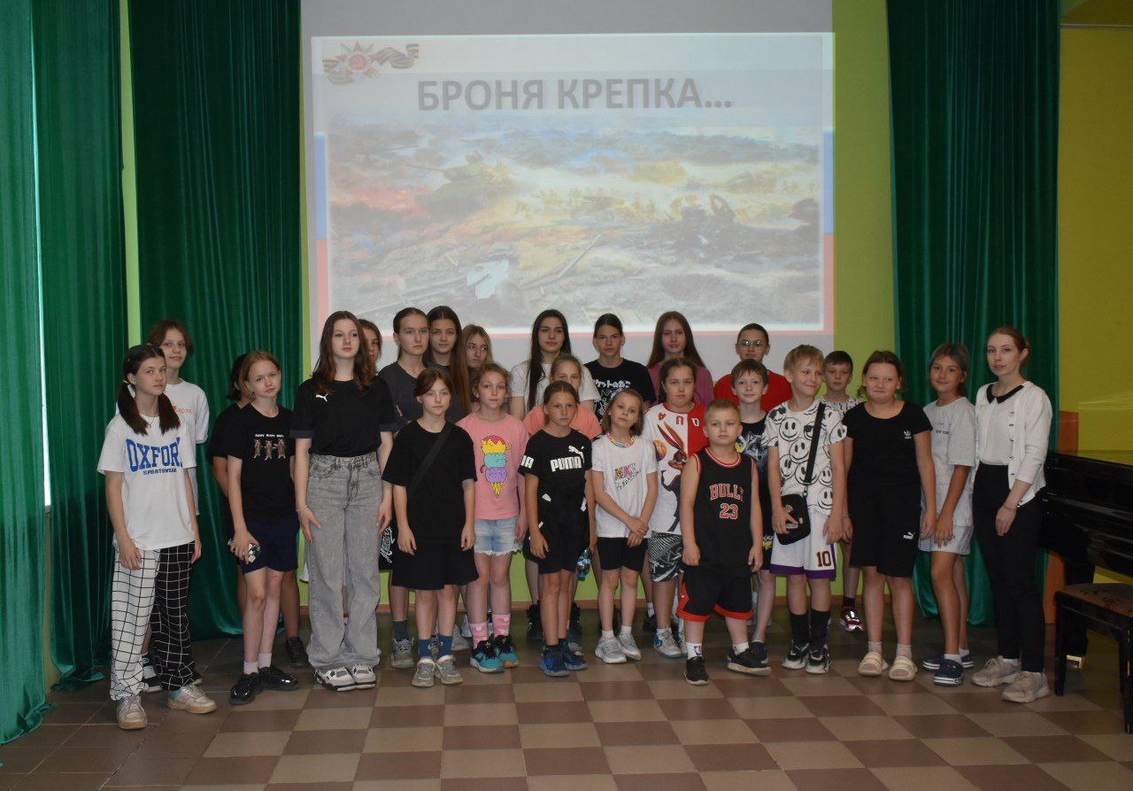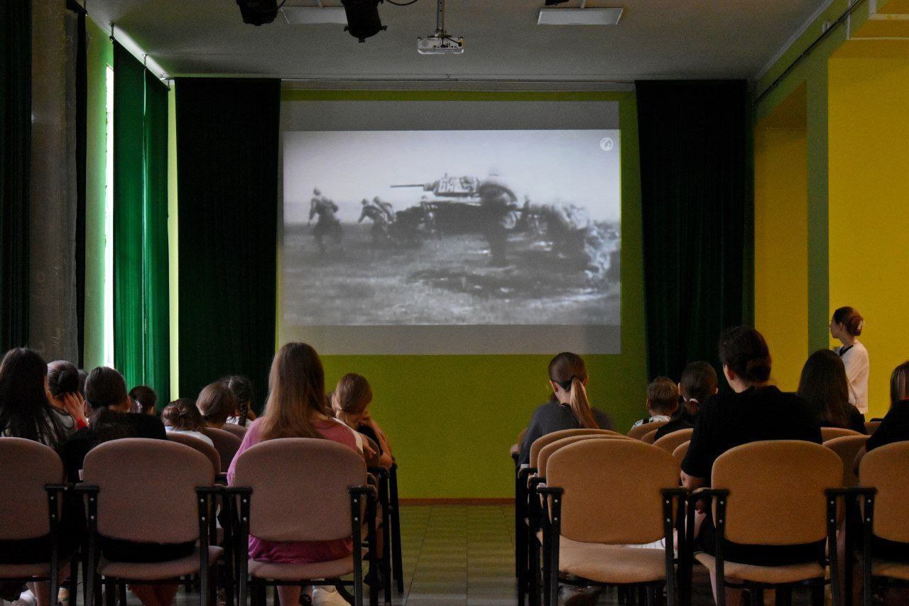 Ведущая познакомила детей городского оздоровительного лагеря "Комета" с ходом сражения, использованной военной техникой и подвигами советских солдат, а так же рассказала о государственном военно-историческом музее-заповеднике «Прохоровское поле» и Белгородском государственном историко-художественном музее-диораме «Курская битва. Белгородское направление».